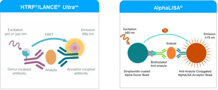 Alpha技术是基于供体微珠和受体微珠间的近距离放大的化学发光反应,HTRF技术是基于铕或铽的穴状化合物(供体)与XL665或d2(受体)之间的时间分辨荧光共振能量转移,两者均基于均相检测技术原理,即所有组分在溶液中自由反应并直接读数,无需洗涤步骤。