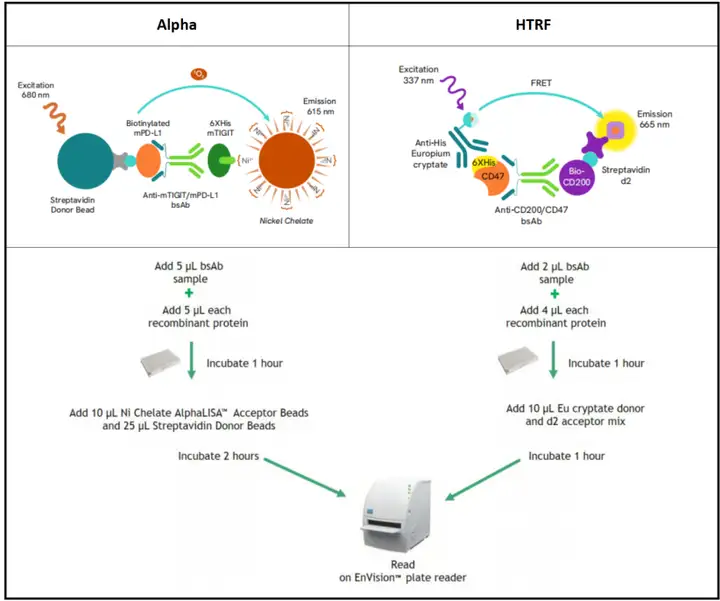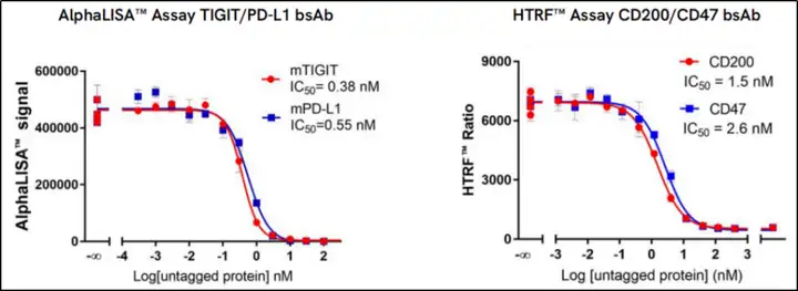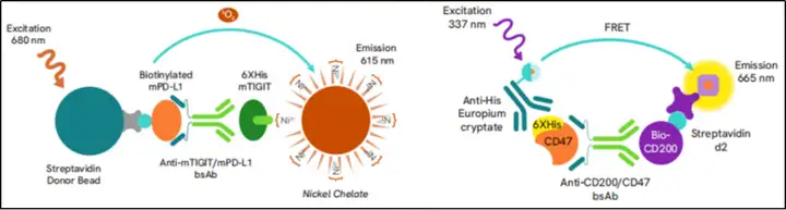 不同结构类型的BsAb都可以使用HTRF/Alpha技术来表征结合活性,以IgG样BsAb为例,其结合活性可通过带有不同标签的抗原(如生物素化抗原与His标签化抗原)及相应标签抗体的toolbox试剂进行评价。