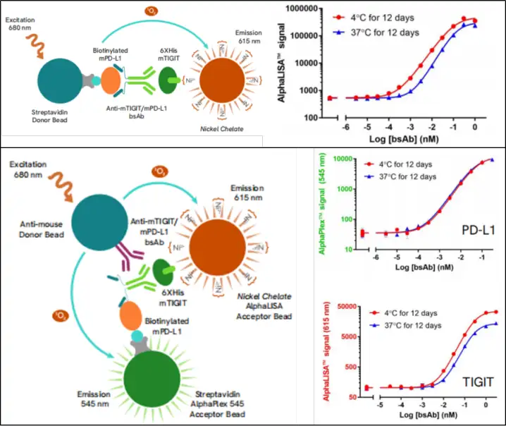 3.瑞孚迪基于AlphaLISA™技术,BsAb在37℃下孵育12天后,检测到BsAb的结合活性受到了影响;基于AlphaPlex™技术,进一步揭示了BsAb在37℃下,BsAb与PD-L1的结合是稳定的,但与TIGIT的结合能力则受到了影响。AlphaPlex™特别适用于分析某个靶点的结合能力是否受损。