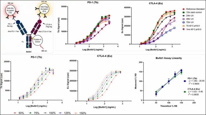 2.瑞孚迪基于AlphaPlex™技术,使用不同荧光微球(Eu/Tb),通过捕获不同的发射波长区分Eu/Tb微球信号,可在同一反应中同时检测BsAb与两个不同靶点的结合。AstraZeneca开发的BsAb AlphaPlex方法在50~150%线性范围内表现出99%~107%的准确率,并检测到光应激和热应激条件下>50%的结合降解。此方法适用于BsAb的先导分子筛选、PK/PD分析、临床相容性、商业批次放行和稳定性测试等。