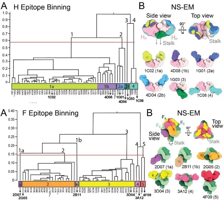 52 株 H-mAb 分出 4 大群(HE-1–4),46 株 F-mAb 分出 5 大群(FE-1–5)。负染电镜快速锁定 12 个 Fab-抗原复合物 footprint,为后续冷冻电镜提供精确占位信息。