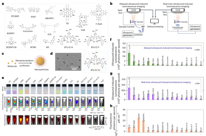 图1系统展示了用于超声诱导发光成像的纳米颗粒的构建与筛选过程:通过纳米沉淀法将15种发光分子(如TD、PFODBT、Ce6等)制备成水溶性纳米颗粒,并建立了两种超声诱导光子采集的成像模型:延迟超声诱导发光成像和实时超声诱导发光成像。在延迟成像模式下,超声换能器放置在溶液样品下/中或动物组织表面,利用超声偶联凝胶激发,激发停止后立即将溶液样品或动物转移到成像暗箱中,使用CCD(电荷耦合器件)相机(来自IVIS Lumina XR成像系统)获取图像。在实时成像模式下,将超声换能器置于成像暗箱内,在暗箱内对样品进行超声波激发。无需转移样品即可同时获得超声诱导发光图像。
