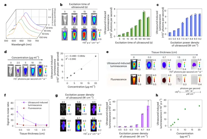 随后研究人员对三蒽衍生物基纳米颗粒(TD NPs)超声诱导发光特性进行了详细的表征。实验结果表明TD NPs在30 kHz、40 kHz、50 kHz、100 kHz等不同超声频率激发下,均呈现相似的发光光谱,峰值集中于625-650 nm,且与自身荧光光谱一致,表明超声激发频率不改变其发光光谱特征(图2a);在延迟成像模式下,2.5 μg/mL、200 μL的TD NPs随超声激发时间(5-120s)延长,发光强度持续上升并在90 s达最大值,随超声激发功率密度(4.5-9.2 W/cm²)升高而逐渐增强,且其浓度与发光强度呈良好正线性关系(R²=0.990),该趋势在实时成像模式下同样存在,即功率密度升高、浓度增加均会使实时成像的发光强度上升;TD NPs的超声诱导发光信号随着组织覆盖厚度增加,信号虽有衰减,但仍能在2.2cm组织厚度下获得有效信号,且在各组织厚度下,其超声诱导发光成像的信噪比均显著高于荧光成像(图2e)。这些特性共同体现了TD NPs在超声诱导发光成像中的潜力。