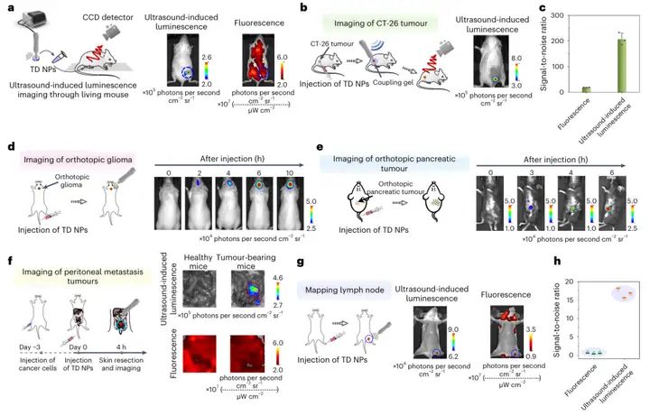 在详细表征TD NPs的超声诱导发光性能后,研究人员设计了不同的动物模型,探究TD NPs在活体动物水平的成像能力,实验结果如图3所示。(1)活体小鼠组织穿透成像验证:将浓度为20 μg/mL、体积200 μL的TD NPs溶液置于小鼠腹部下方1.6 cm处,对TD NPs进行超声预激发后,分别采集超声诱导发光图像与荧光图像。结果显示,超声诱导发光从小鼠腹部上方可观测到强烈信号,而荧光信号几乎与背景无法区分,直观证明了超声诱导发光在活体组织中具备更优的穿透能力,能有效避免组织对信号的干扰(图3a)。(2)皮下CT-26肿瘤成像:构建皮下CT-26肿瘤小鼠模型,向肿瘤内注射TD NPs,对肿瘤区域进行超声预激发后进行成像。图3b中,超声诱导发光图像清晰显示肿瘤区域有强烈信号,而小鼠其他部位几乎无背景信号;图3c对两种成像方式的信噪比量化分析表明,超声诱导发光的信噪比约为206,是荧光成像的11.7倍(P=2×10⁻⁴),证实该技术在皮下肿瘤成像中具有高特异性和高信噪比,能精准定位肿瘤位置。(3)原位脑胶质瘤成像:建立小鼠原位胶质瘤模型,经静脉注射TD NPs后,在不同时间点对小鼠头部区域进行超声预激发(1 MHz、1.5 W/cm²,15 s)并成像。结果显示,注射后不同时间点,胶质瘤小鼠头部区域的超声诱导发光信号呈动态增强趋势,表明TD NPs可通过血液循环到达脑部深层肿瘤部位并被超声激活发光,验证了该技术对深层原位肿瘤的成像可行性,如图3d所示。