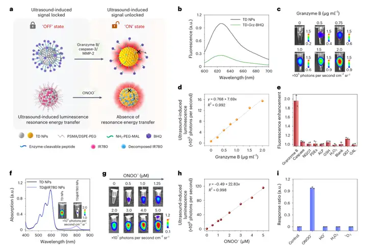 随后,研究人员继续拓展了超声诱导发光成像的应用,基于共振能量转移(FRET)机制,将TD纳米颗粒(供体)与BHQ-3或IR780(受体)通过酶切肽段(如Granzyme B、MMP-2、Caspase-3识别序列)或ROS响应结构连接,构建出“信号关闭”状态的探针。当目标酶或ONOO⁻存在时,肽段被切断或染料结构被破坏,FRET效应消失,TD纳米颗粒在超声激发下恢复强发光信号,实现高选择性、高灵敏度的“信号开启”检测。实验结果显示,TD-Grz-BHQ探针对Granzyme B的检测限低至亚微克级别,且对其它酶无交叉反应;TD@IR780探针对ONOO⁻响应灵敏,呈良好线性关系,验证了该类探针在免疫应答监测与氧化应激成像中的强大潜力,如图4所示。