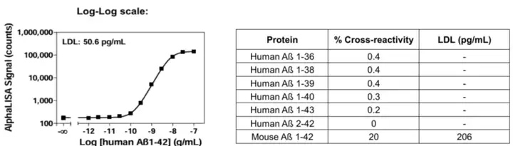 图三. AlphaLISA Aβ(1-42)试剂盒标准曲线和交叉反应数据