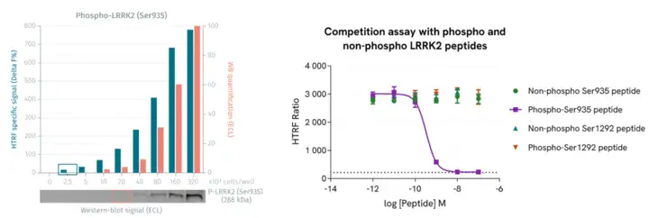 图六. HTRF LRRK2 Ser935磷酸化检测试剂盒方法学对比和化合物抑制曲线
