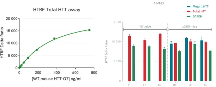 图七. HTRF total HTT检测试剂盒标准曲线和小鼠模型检测数据