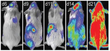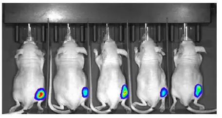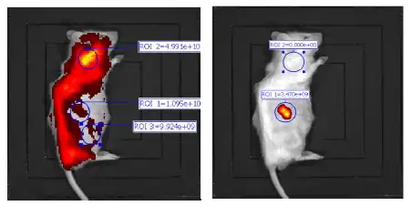 IVIS小动物活体成像仪能够实现无创性检测小鼠体内疾病发展情况,通过生物发光/荧光发光的方式在小鼠体内进行标记后,即可实现长期、连续性的动态监测疾病的发生发展。