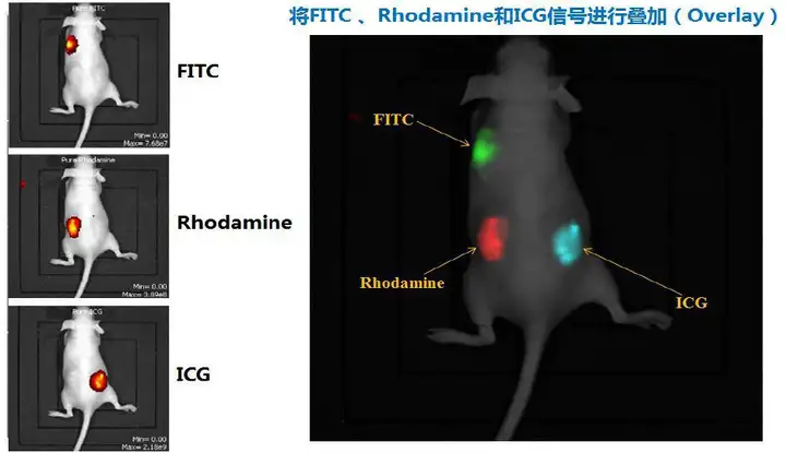 使用荧光成像时,由于信噪比较小,且成像时易受到一些荧光干扰,导致成像结果不准确,可IVIS特有的荧光光谱拆分技术,对组织背景的荧光干扰进行去除,并且能够更好的展现较弱的荧光信号;另外,光谱拆分应用于多种荧光标记的动物体内,将各种信号进行叠加,实现多重标记的图片展示。