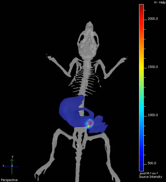 IVIS小动物活体成像仪能够通过信号的深度、位置,来计算和模拟小鼠三维模式下的荧光标记定位信息,更直观的表现出标记定位于何种器官或组织中。