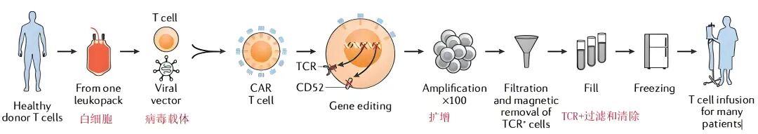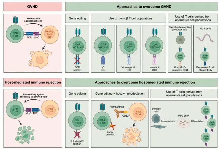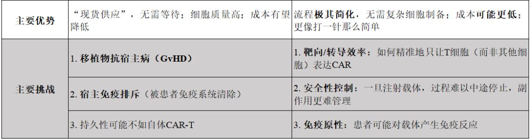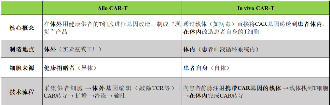 在今年的国际科技博览会开幕式上,中国科学技术信息研究所发布了《颠覆性技术前瞻(2025)》报告,遴选出40项最具突破性价值技术。其中,生命科学领域就包括10项。如果让您选,这10项都包括什么?思考一下~侵入式脑机接口、AI蛋白质生成、下一代RNA药物、通用型CAR-T细胞疗法、靶向蛋白降解技术、细胞重编程技术、大片段DNA操纵技术、异种移植技术、体电子显微镜和单原子编辑技术。看到通用型CAR-T细胞疗法,我就在想,通用/异体CAR-T和in vivo CAR-T两者都超越了传统意义上的CAR-T疗法,那这两者间又有什么不同呢?从应用角度讲,哪个更有开发潜力呢?我们就一起梳理一下~为了写起来方便,我们统一称,体内CAR-T:in vivo CAR-T;通用/异体CAR-T:AlloCAR-T。先看“官方”的解释:通过白细胞分离术从健康供体采集T淋巴细胞。病毒载体介导的转基因技术或基因敲入技术,可将编码CAR的重组DNA永久整合至上述淋巴细胞内,并可同时插入其他基因,如共刺激受体。通过上述技术还能消除T细胞中αβ T细胞受体(TCR)和CD52的表达。随后使用抗CD3/抗CD28磁珠及细胞因子对T细胞进行扩增。残留的αβ TCR阳性细胞通过抗αβ TCR抗体进行磁珠分选去除。最终将AlloCAR-T分装至冻存管,在需要时运抵医疗机构。通俗的讲,其实就是:从健康的捐赠者(非患者本人)体内采集T细胞→进行基因工程改造(装上CAR)→同时,通过基因编辑技术(如CRISPR/Cas9)敲除可能引起排斥的基因→扩增后制成“现货”产品,冷冻储存→当有患者需要时,可直接解冻输注。看到“官方”的制备过程,其实我主要思考的有两个问题:为何要去除T细胞中αβ T细胞受体(TCR)和CD52的表达?为何选择使用抗CD3/抗CD28磁珠进行T细胞扩增?Allo CAR-T制备过程中,去除T细胞中αβ T细胞受体和CD52,是为了解决两大根本性挑战:安全性和有效性/持久性。去除 αβ TCR 的表达,其核心目的是防止移植物抗宿主病(GvHD)!什么是GvHD?捐赠者的T细胞不仅带有我们人工导入的CAR,还天然表达它们自己的TCR。捐赠者的TCR会识别患者(宿主)体内正常组织的主要组织相容性复合体(MHC/HLA)为“外来异物”。一旦识别,这些输入的CAR-T细胞就会攻击患者的正常组织器官(如皮肤、肝脏、肠道等),引发GvHD。GvHD是一种非常严重且可能致命的并发症。而αβ TCR是介导GvHD的主要TCR类型。所以要进行去除。去除 CD52 的表达:核心是为了解决Allo CAR-T有效性和持久性问题。这里又不得不提到另外一个概念,宿主免疫排斥(HvGR)。什么是HvGR?患者的免疫系统会将输入的、来自他人的CAR-T细胞识别为“外来物”并发动攻击,试图将其清除。这会导致CAR-T细胞在患者体内无法扩增或迅速被消灭,从而使治疗失败。CD52是一种广泛表达在T细胞、B细胞、NK细胞、单核细胞等免疫细胞表面的蛋白。清除CD52,其实就是为了消除患者自身免疫细胞“排除异己”的能力。根据已发表的文献,Allo CAR-T疗法主要有:in vivo CAR-T,可简单理解为:“体内基因疗法”。它不再是输注细胞,而是输注一种携带CAR基因的工程化病毒载体。这个载体像一枚“智能导弹”,进入人体后,会寻找并感染T细胞,然后将CAR基因整合进T细胞的DNA中,从而让这些T细胞“原地变身”为CAR-T细胞。目前大多处于临床前或早期临床研究阶段,技术挑战更大,但如果成功,将是颠覆性的。表1 in vivo CAR-T vs Allo CAR-T
