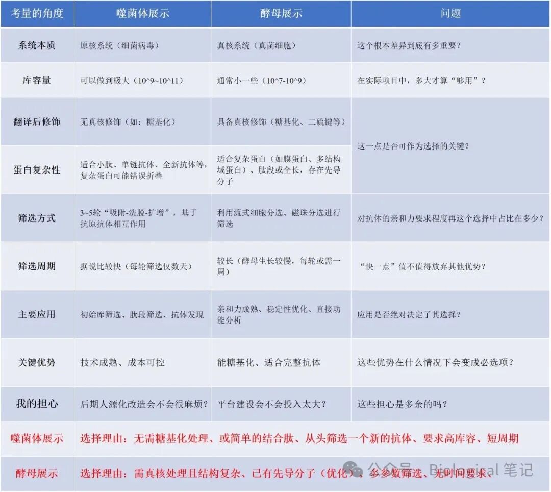 1 理解的基础知识对比 为了这个问题,小编还是做了些功课。以下是小编整理的内容对比(图1,或许很浅显),请技术大神们帮忙纠错和补充,一起充盈这个问题的答案: 图1 噬菌体/酵母展示系统的对比及其选择理由 小编知道,这张表或许不全面,也或许存在某些漏洞。如果您发现任何错误,烦请在评论区指出来——这对所有读者都是最直接的帮助 2 了解的几种说法 在调查中,小编了解到这些说法,但小编无法判断它们的普适性: 说法A:“看项目时间” “如果急着要结果,比如6个月内必须有先导分子,那无脑选噬菌体展示。” 说法B:“看靶点特性” “如果是需要糖基化才有功能的靶点,或者膜蛋白,那酵母展示可能更合适。” 说法C:“看团队经验” “你们实验室历史上擅长哪种,就选哪种。换技术路线需要交学费。” 说法D:“看长远规划” “如果是要建立一个长期平台,酵母可能是未来趋势;如果只是一个短期项目,噬菌体更稳妥。” 这些观点对于最终决定使用哪种方式,会不会太笼统了, 我想知道的是: 您在实际项目中,真正做出选择的那一刻,哪个因素起了决定性作用? 有没有一些教科书没写、但实战中很重要的但决定最终选择的细节? 您最想提醒新手注意的是什么? 3 具体求助--请分享您的实验经验 您可以这样给小编(和其他读者)提供帮助: 方式一:直接纠正小编的错误 “你表格里第X行写错了,实际应该是……” “你漏掉了一个关键因素:……” 方式二:分享您的决策故事 “我们之前做XX项目之前,面临类似选择。但我们选了A,因为……结果是……如果重来,我会……” 方式三:给出具体场景的建议 “如果项目符合这3个条件:①……②……③……,那么选A;如果符合那3个条件,选B。” 方式四:指出常见误区 “新手最容易在这个问题上犯的错误是……,实际上应该……” 为方便阅读,建议您用这样的格式留言: 【我的经验分享】 背景:_________ 最终选择:_________ 关键理由:_________ 结果与反思:_________ 给新手的建议:_________ 您的一句话建议,可能会影响另一个团队的半年时间。 4 您分享后,小编会做什么? 1. 认真对待每一条留言 1)所有技术相关留言小编都会仔细阅读; 2)对所有分享小编会直接回复感谢; 3)明显错误的科普小编会在评论区置顶纠正; 2. 整理成【读者智慧合集】 1)7天后,小编将根据您的分享,整理出一篇真正的技术指南: 标题暂定:《噬菌体vs酵母:XX位一线研发者的实战选择指南》 2)内容完全基于您的留言(会匿名处理): 但会标注哪些建议收到了多位验证(形成共识); 也会保留那些独特的、但有价值的个人经验; 6 文章求助目的 首先,小编坚信术业有专攻,且实践才是检验和丰富真理的途径,小编自己的研究方向不在这块,所以了解到的知识仅限能查到的资料; 其次,对于本公众号的目的就是想方便大家的学习,既然有小伙伴存在这样的疑问,那说明其他人也会有这样的顾虑和思考; 最后,如果这次“求助”,能促成一次真诚的经验分享,让一些实战智慧被记录下来、传播出去,那么这篇文章的价值就实现了,当然这需要大家的帮助~ 6 小编承诺 1. 保持开放:无论您的观点是主流还是小众,只要基于真实经验,均会尊重 2. 如实记录:您的分享不会被断章取义 3. 持续学习:这是一段学习的过程,将会认真对待每一位老师的指点 技术之路,因分享而平坦。期待您的指教。