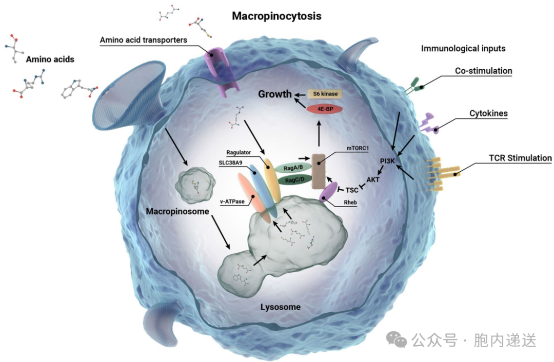 T 细胞通过巨胞饮作用将细胞外氨基酸(亮氨酸、谷氨酰胺、精氨酸、丝氨酸,即 LQRS)转运至溶酶体,而这种转运对于雷帕霉素机制性靶蛋白复合物 1(mTORC1)的激活至关重要,mTORC1 的激活则会驱动 T 细胞生长。