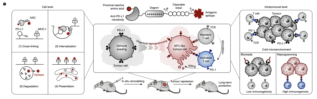 分享一篇肿瘤疫苗的文章,在肿瘤原位将肿瘤细胞转变为抗原提呈状态,以激活肿瘤内T细胞发挥抗肿瘤作用。巧妙之处在于靶向降解PD-L1的同时将外源抗原肽引入细胞内,促进肿瘤细胞提呈该抗原肽,既解除了免疫抑制,又提呈抗原激活了T细胞。具体内容如下: