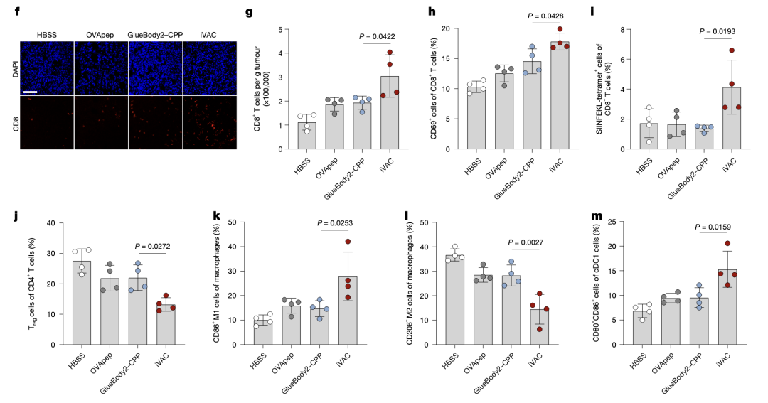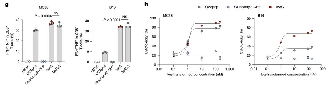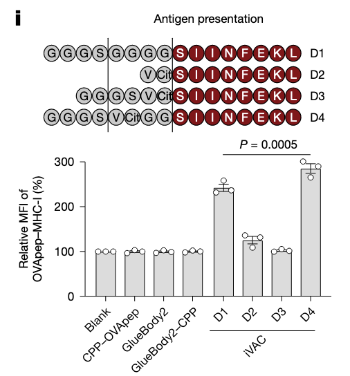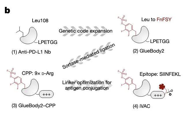 iVAC结构:Gluebody2结合PD-L1,偶联CPP穿膜肽实现靶向降解,通过Sortase A连接OVA肽,实现抗原提呈。