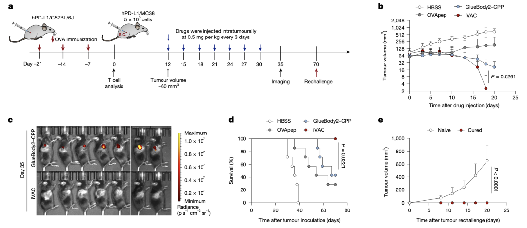 体内抗肿瘤实验。iVAC治疗疗效显著,且能诱发免疫记忆抵抗rechallenge。