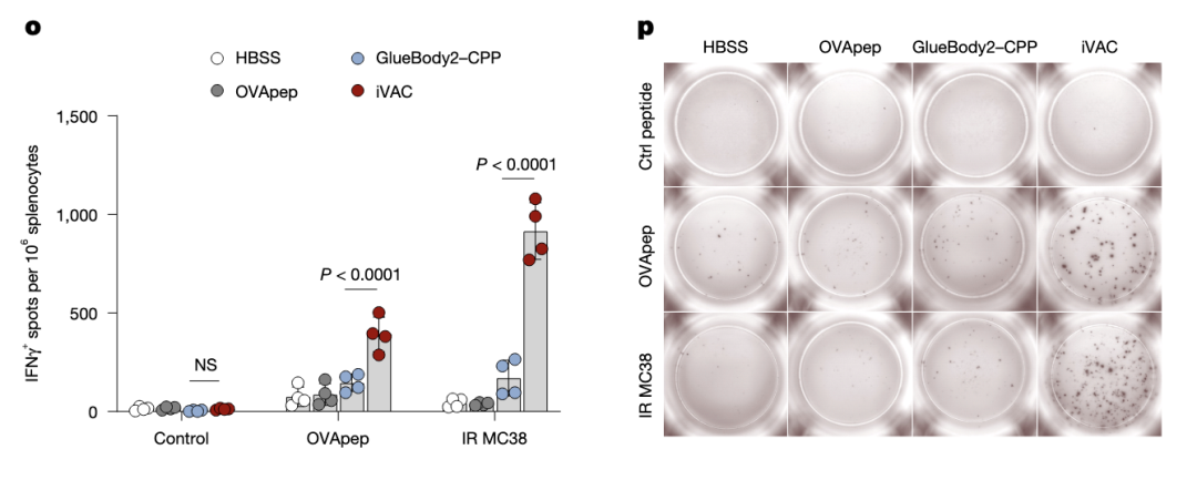ELISPOT检测,iVAC治疗不仅引起针对OVA肽的免疫反应,同时也诱发出针对MC38肿瘤抗原的免疫反应,表明存在抗原播散效应。