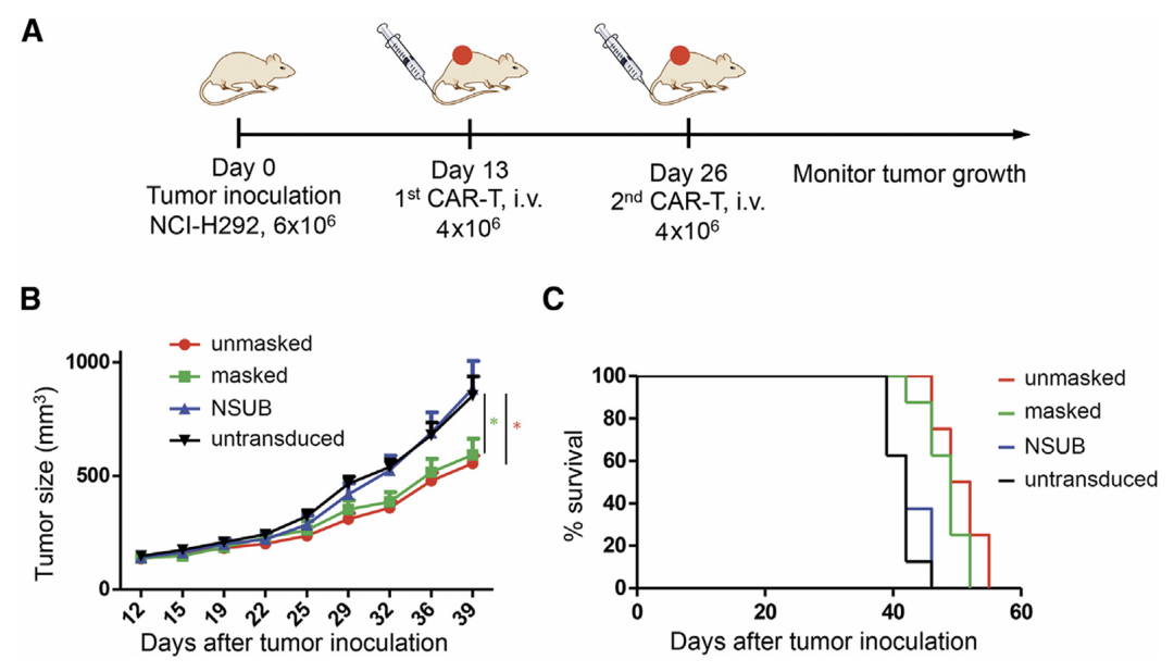 masked CAR在正常组织静默,到肿瘤被蛋白酶掀开面具后才完全恢复结合-激活-杀伤活性,实现同等疗效同时把正常组织on-target off-tumor风险压到最低。这项早期研究证实了改善传统CAR安全性的可行性,并可能为今后设计靶向广泛表达TAA的CAR分子提供新思路。