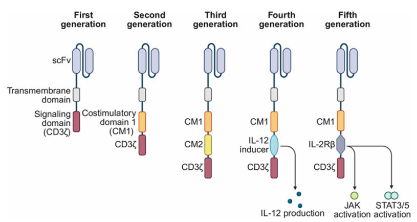 CAR技术已历经五代迭代升级:第一代仅含基础激活信号域,疗效有限;第二代引入CD28或4-1BB共刺激域,大幅提升T细胞增殖与存活能力,在血液肿瘤中疗效最佳;第三代串联双共刺激分子,但临床优势尚不明确;第四代整合细胞因子分泌模块或安全开关,为实体瘤治疗带来突破;第五代新增细胞因子受体信号域,通过激活JAK-STAT通路增强T细胞活性,同时降低细胞因子释放综合征(CRS)风险,目前处于临床研究阶段(图2)。