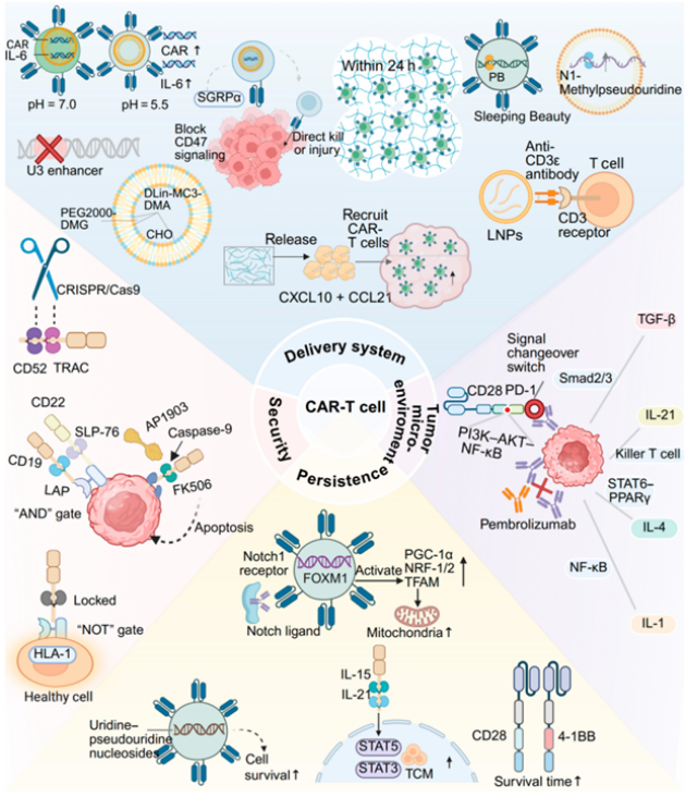 递送优化:可植入生物支架或纳米载体局部递送,突破物理屏障,提升 CAR-T 细胞在肿瘤部位的浓度(图4)。