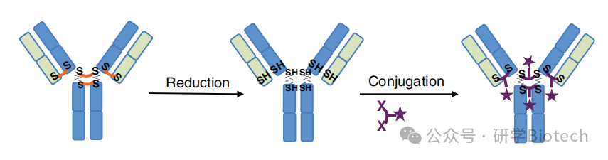 Junutula等人率先利用工程化半胱氨酸制备定点特异性ADC,即THIOMABs。这项工作利用了之前开发的噬菌体展示方法,来识别将活性半胱氨酸插入抗体Fab片段的位点。在全长人IgG1背景下评估了轻链上的8个位点和重链上的4个位点,发现重链CH1结构域中的A114C位点表现出良好的表达和偶联效率。即使在这个优选位点,发现引入的半胱氨酸在表达和纯化后与谷胱甘肽、游离半胱氨酸等其他含硫醇化合物甚至抗体轻链形成二硫键连接。对于偶联,将所有溶剂可及的(即引入的和链间的)二硫键还原,然后使用硫酸铜或脱氢抗坏血酸重新氧化链间二硫键。