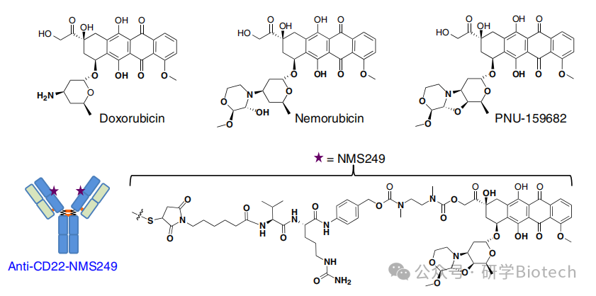 图4 强效蒽环类化合物与抗CD22-NMS249的结构