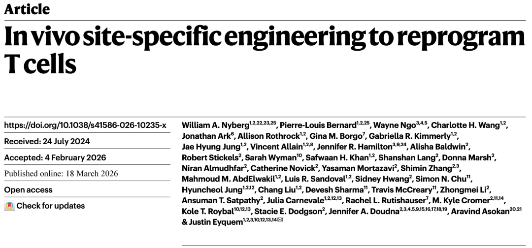 周末愉快,分享一篇病毒载体in vivo CAR-T的Nature主刊,具体内容如下: