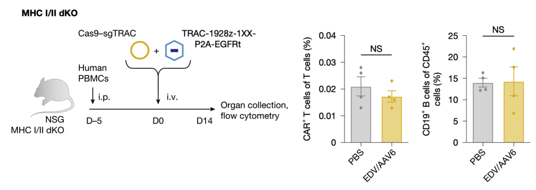 当人源化小鼠MHC缺陷,EDV+AAV介导靶向CD19的CAR表达、干掉B细胞的作用受限,暗示载体表达依赖小鼠MHC对T细胞的调动作用