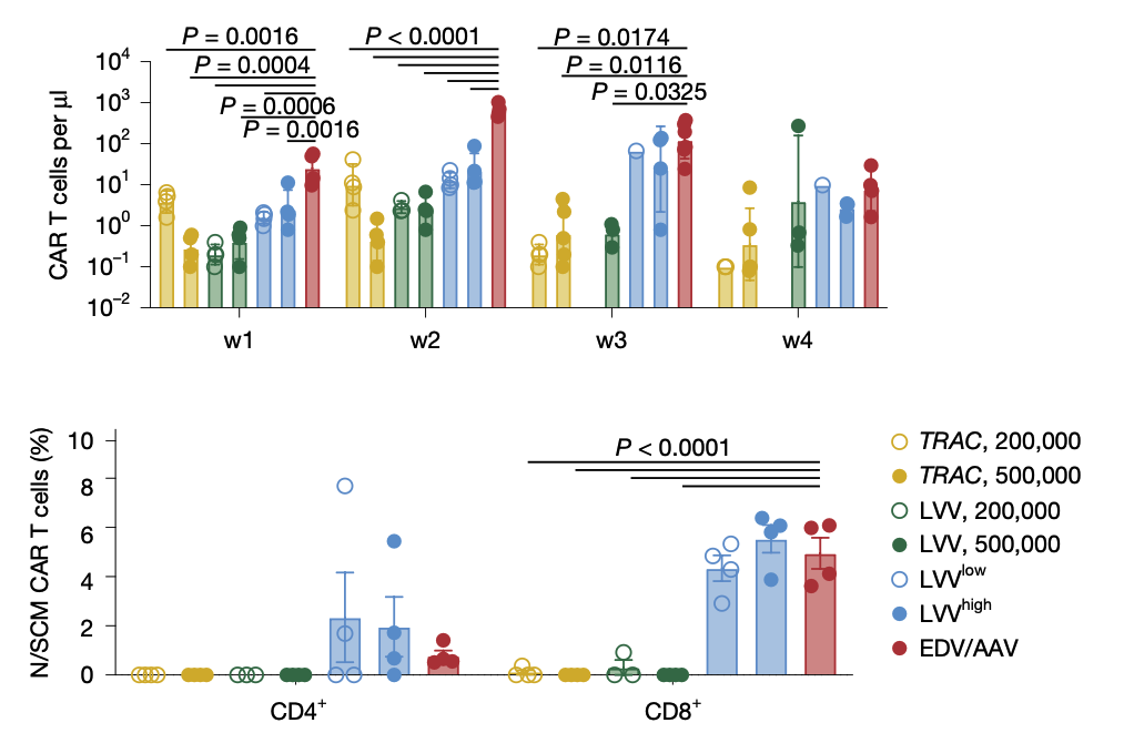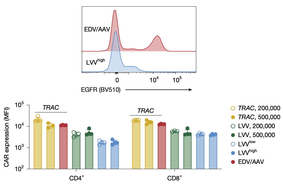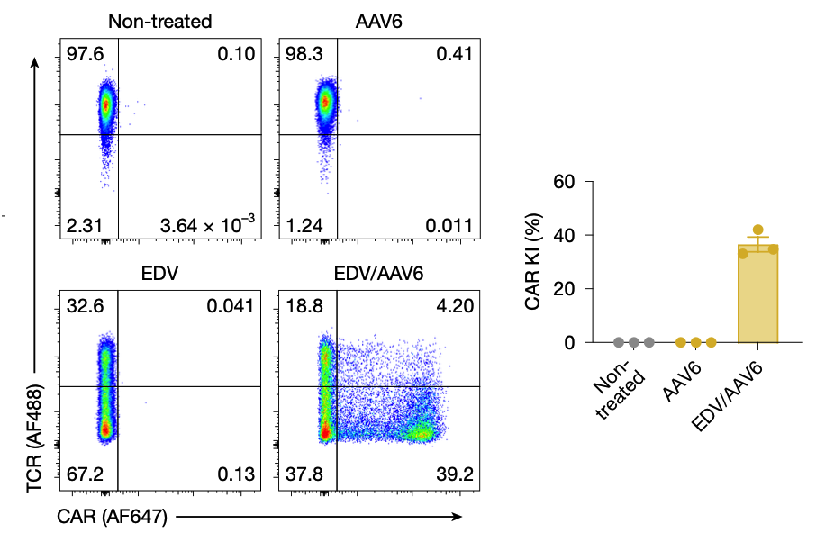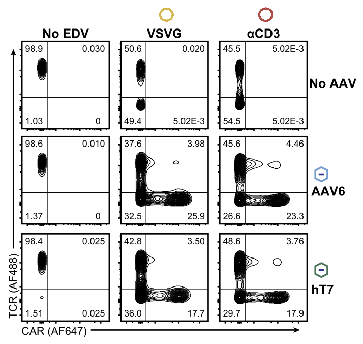 EDV+AAV干掉TCR,介导CAR表达(右下象限)