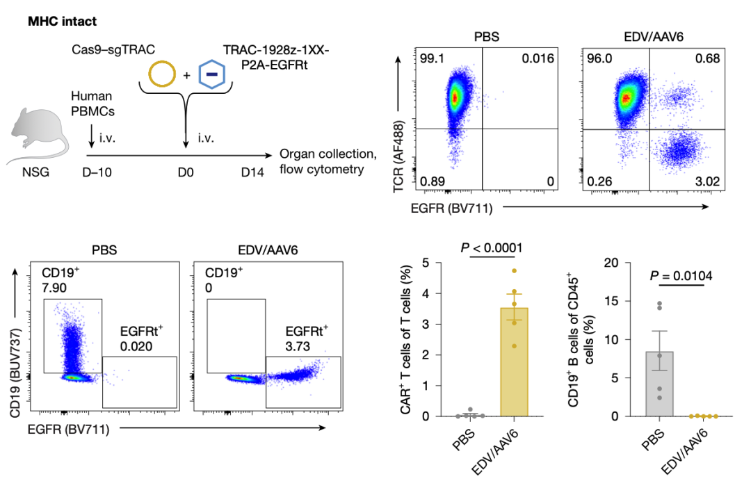 NSG小鼠注射人PBMC构建人源化小鼠,体内,EDV+AAV介导靶向CD19的CAR表达,干掉B细胞