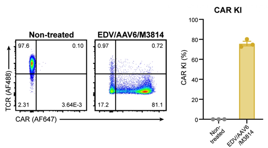 DNA-PK抑制剂M3814(可抑制DNA修复中的非同源末端连接NHEJ,NHEJ会干扰同源介导修复HDR)促进EDV+AAV干掉TCR、介导CAR表达