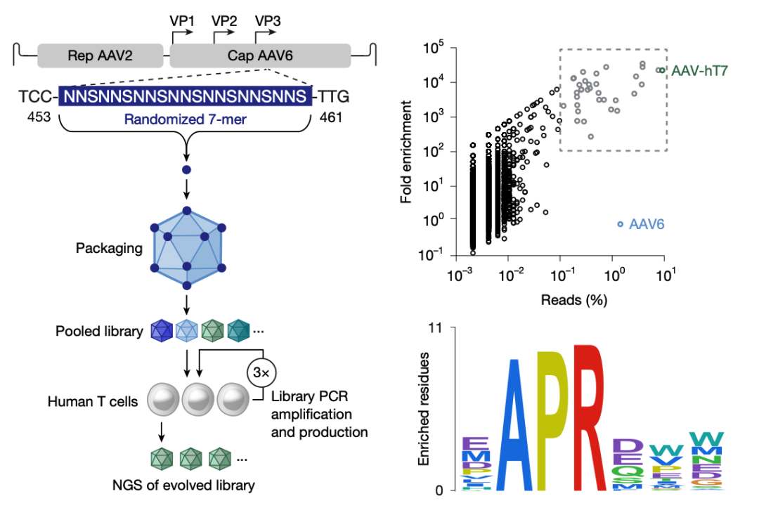 优化AAV:AAV+人T细胞+人血清(血清内含中和AAV的抗体)共培养后,测序T细胞,筛选挖掘可抵抗中和的AAV,筛到了AAV-hT7