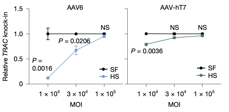 人血清HS影响AAV6递送效率,但筛到的AAV-hT7可抵抗人血清中的中和抗体(SF无血清)