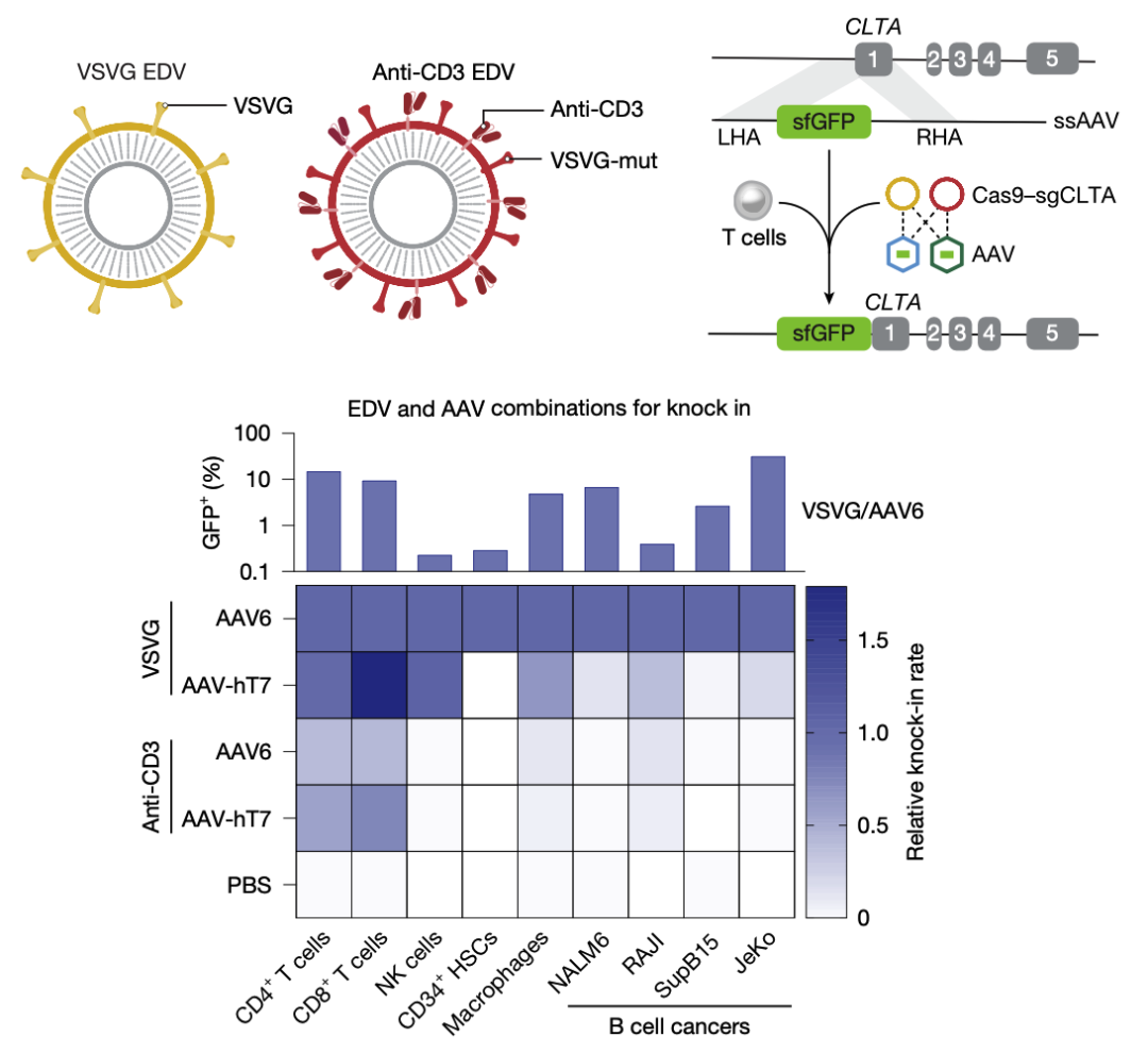 病毒载体in vivo CAR-T一大问题在于CAR序列随机整合进基因组带来的风险,作者计划用双病毒载体策略:EDV递送切开T细胞TRAC位点的RNP(CRISPR Cas9+sgRNA),AAV递送含CAR基因的同源介导修复HDR模版,EDV+AAV实现把CAR基因定点整合到TRAC的目的(HDR介导定点整合的文章非病毒定点整合制备CAR-T、T细胞靶向AAV的文章筛选用于T细胞基因编辑的AAV我们都整理分享过)