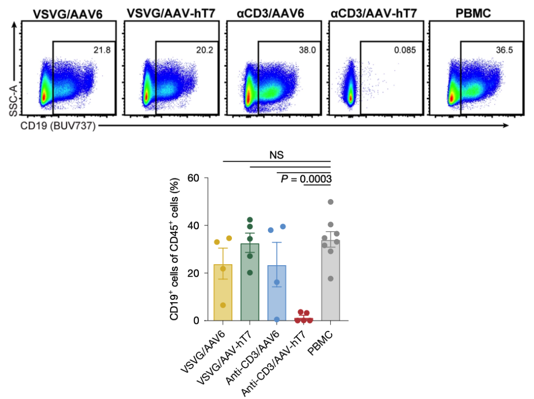 anti-CD3 EDV+AAV-hT7在人源化小鼠体内高效干掉B细胞