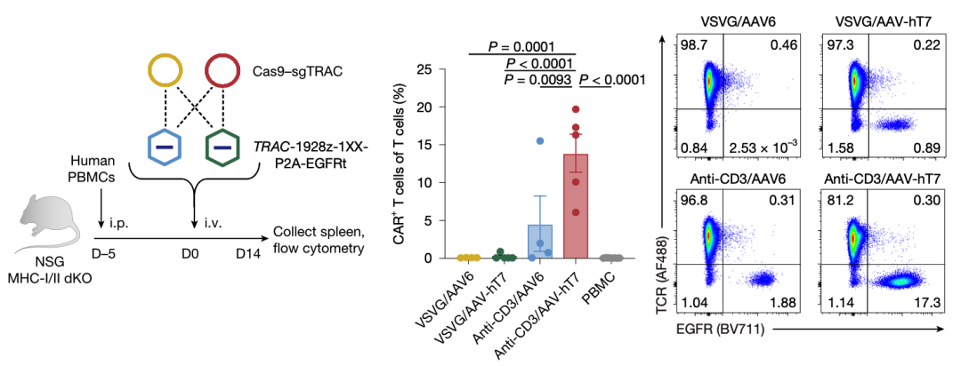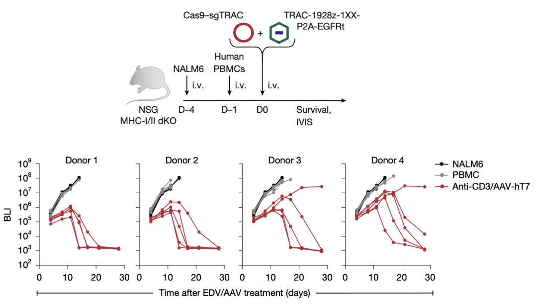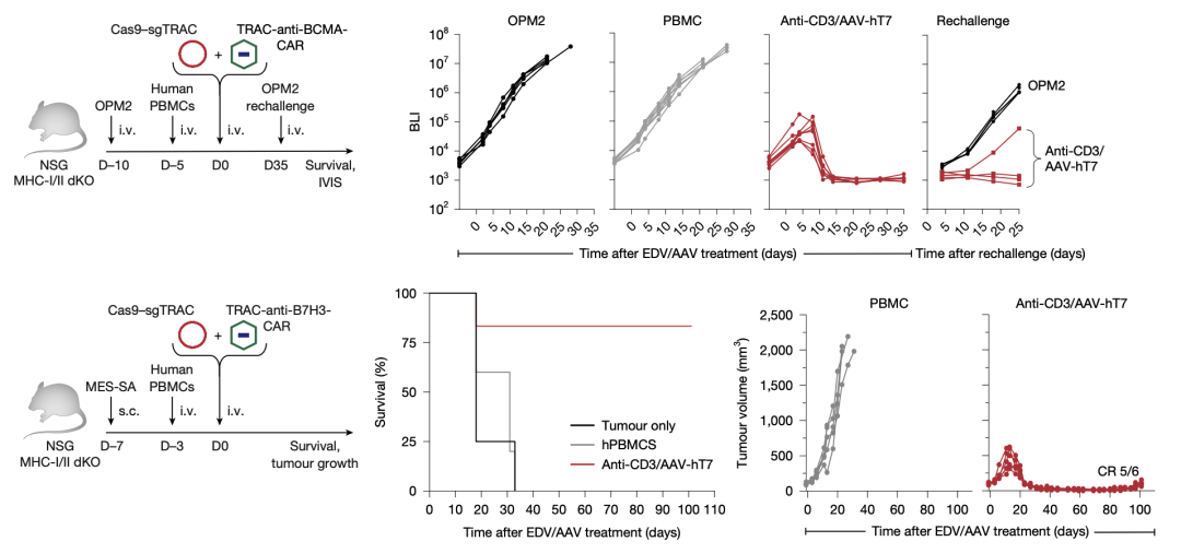 体内验证病毒载体组合,anti-CD3 EDV+AAV-hT7在人源化小鼠体内不依赖MHC的高效干掉TCR、介导CAR表达