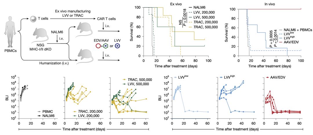 作者的AAV/EDV双载体in vivo CAR-T疗效优于传统的ex vivo CAR-T(LVV指示随机整合,TRAC指示定点整合)