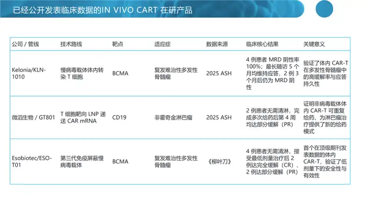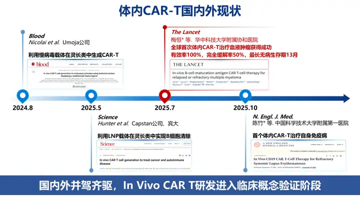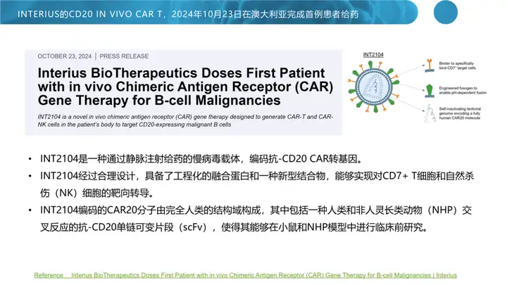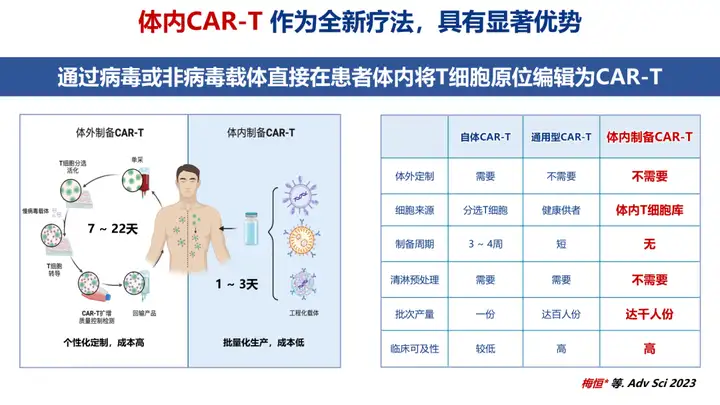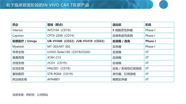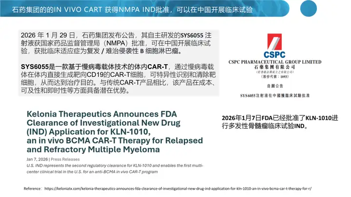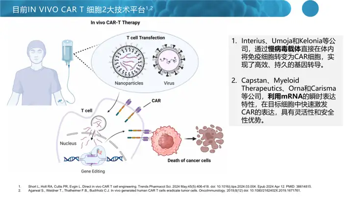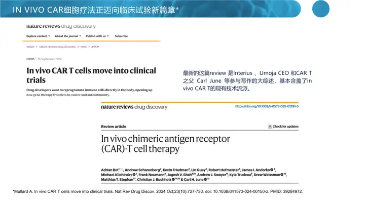 首先推荐大家去看Nature Drug Discovery 发表的review,是Interius CEO 、Umoja CEO 和CAR T之父 Carl June 等参与写作的大综述,基本涵盖了in vivo CAR T的现有技术流派和临床前数据。其次石药集团的慢病毒载体in vivo CAR T(SYS6055)率先在中国获批IND,给业界一个惊喜,这款CD 19 in vivo CAR T计划适应症是复发难治侵袭性B细胞淋巴瘤,将在北京大学肿瘤医院开展临床试验。