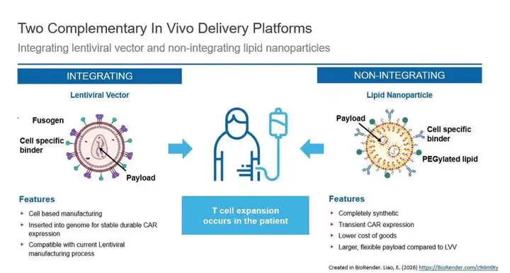 目前正在研究多种体内CAR-T细胞治疗平台,包括整合型和非整合型。整合型平台通常依赖于病毒载体,例如慢病毒,类似于大多数已获批准的CAR-T疗法中使用的载体。与其他病毒基因治疗策略一样,这些平台也存在已知的风险,包括插入突变的可能性。
