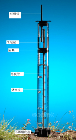 Mini Disk分上下两个管室,两管室内都需装水,其中上管室(气泡室)用于控制虹吸程度,通过虹吸管高度的调节来控制水压;下管室像一个刻度量筒,标有ml为单位的刻度,下管室中一定体积的水将以虹吸管控制的速度渗透到土壤中。Mini Disk的底部是一个多孔的熔结不锈钢底座,该底座保证管内的水不会渗漏到开放空气中,而且小直径底座方便在相对水平的土壤表面上进行测定。
